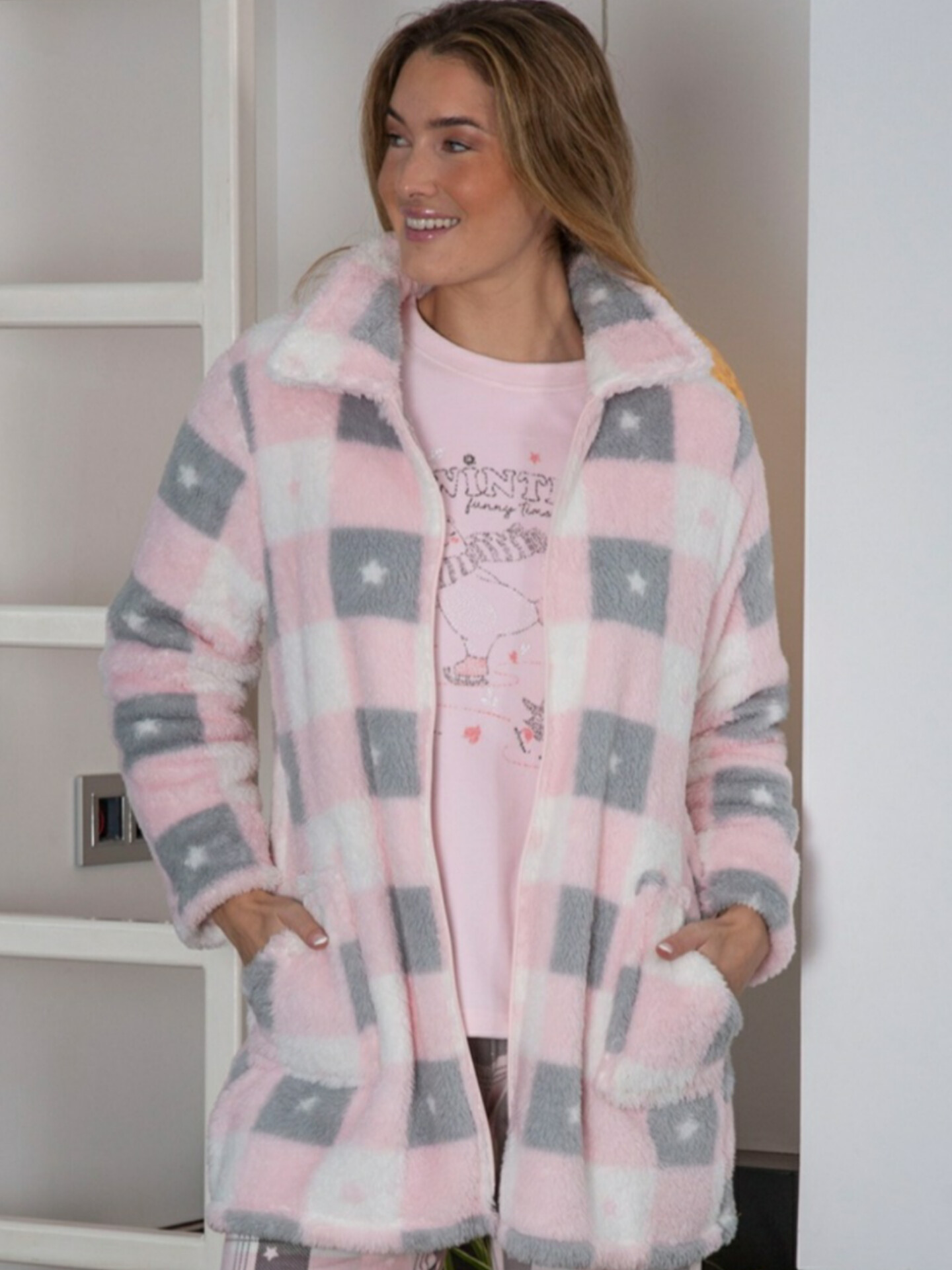 Bata de mujer con cremallera,  de cuadros,  con bolsillos laterales,aislado. De la marca Muslher.