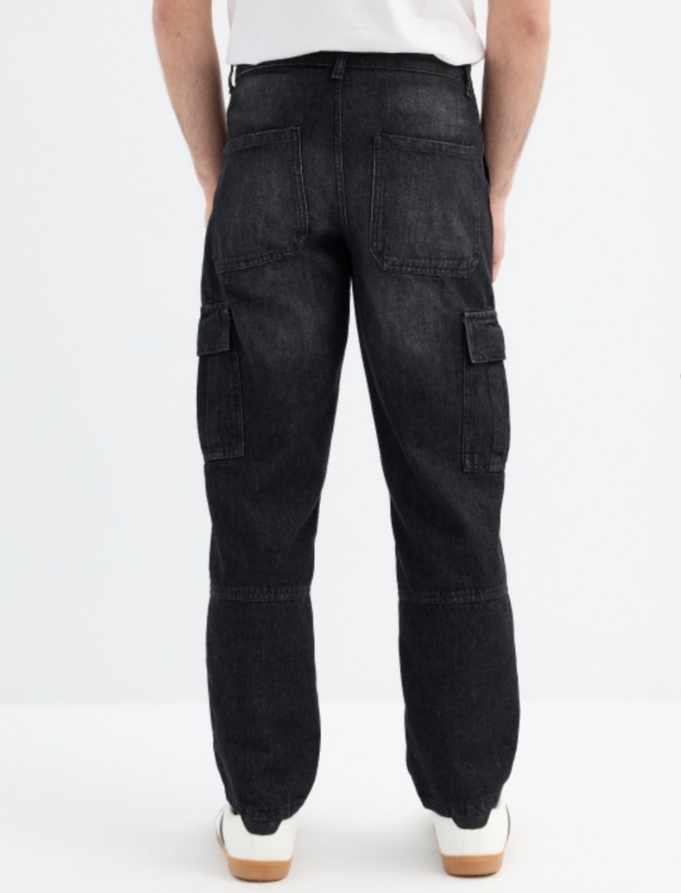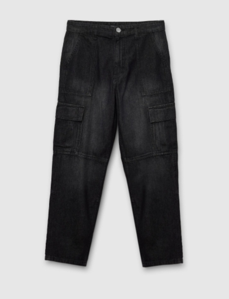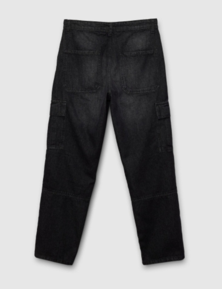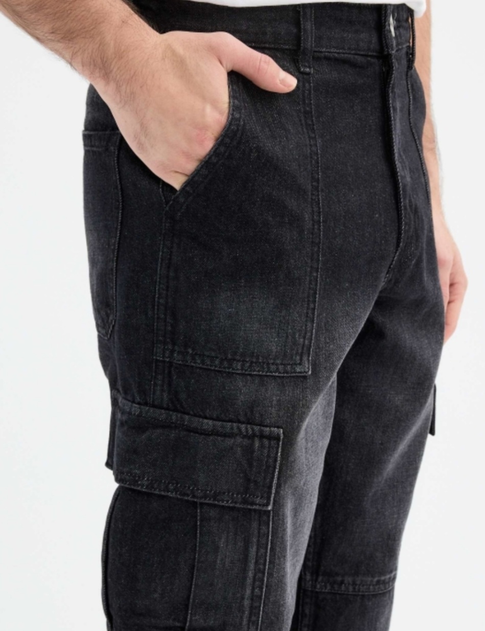 Jeans cargo de tiro alto, confeccionado en tejido de algodón, diseño multibolsillos, cintura con trabillar y cierre de cremallera y botón.