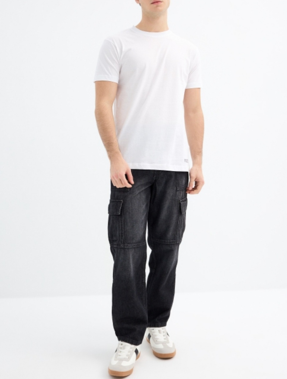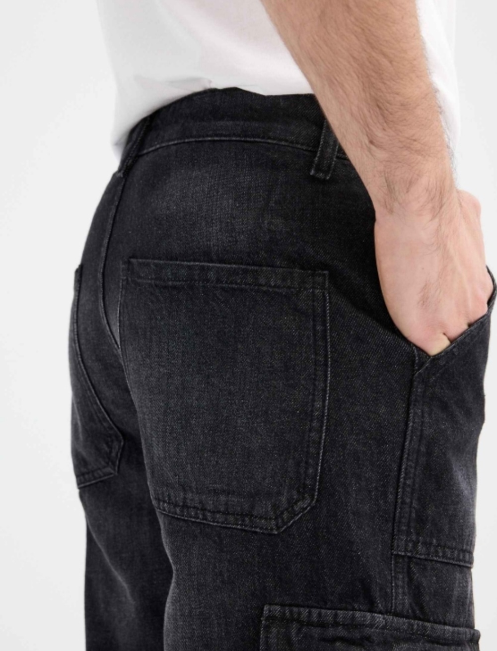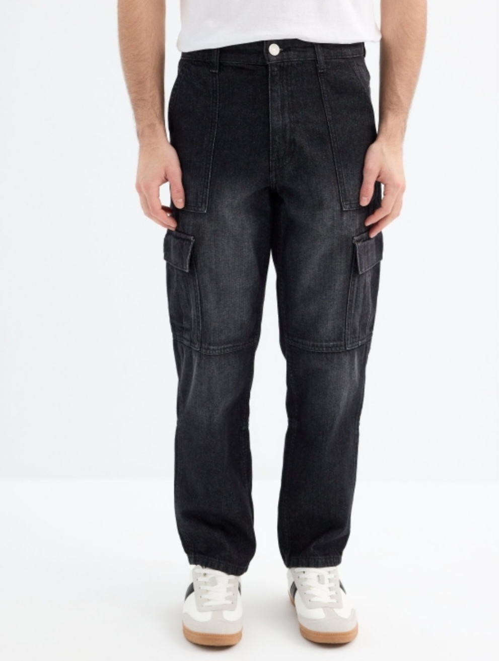 Jeans cargo de tiro alto, confeccionado en tejido de algodón, diseño multibolsillos, cintura con trabillar y cierre de cremallera y botón.