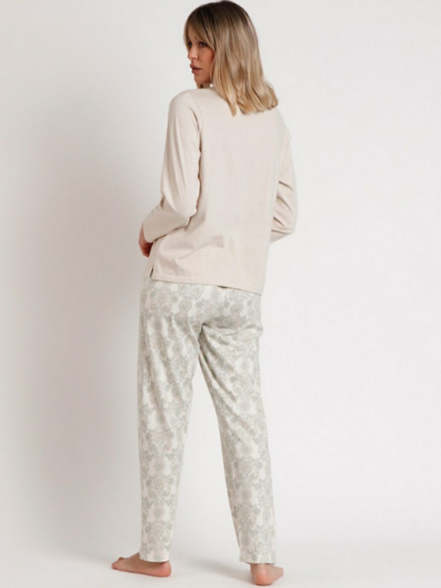 Pijama de mujer que combina camiseta de manga larga y escote de pico en color liso con pantalón estampado, confeccionado en tejido de viscosa. Marca Admas. Se envía en caja.