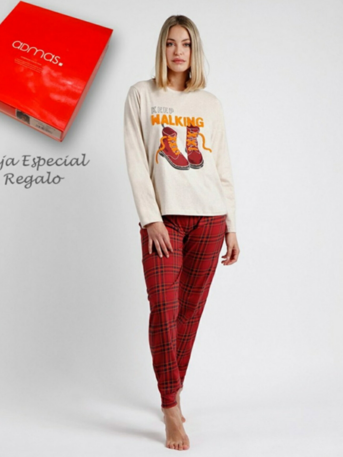 Pijama de algodón para mujer con camiseta de punto vigoré con detalles bordados a juego con pantalón de cuadros con puños. Marca Admas. Se envía en caja.