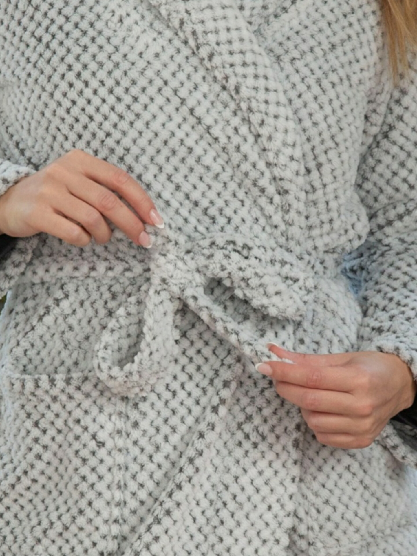 Bata larga de mujer en cálido tejido de coralina a relieve, cruzada con cinturón y con bolsillos frontales. Marca Muslher.
