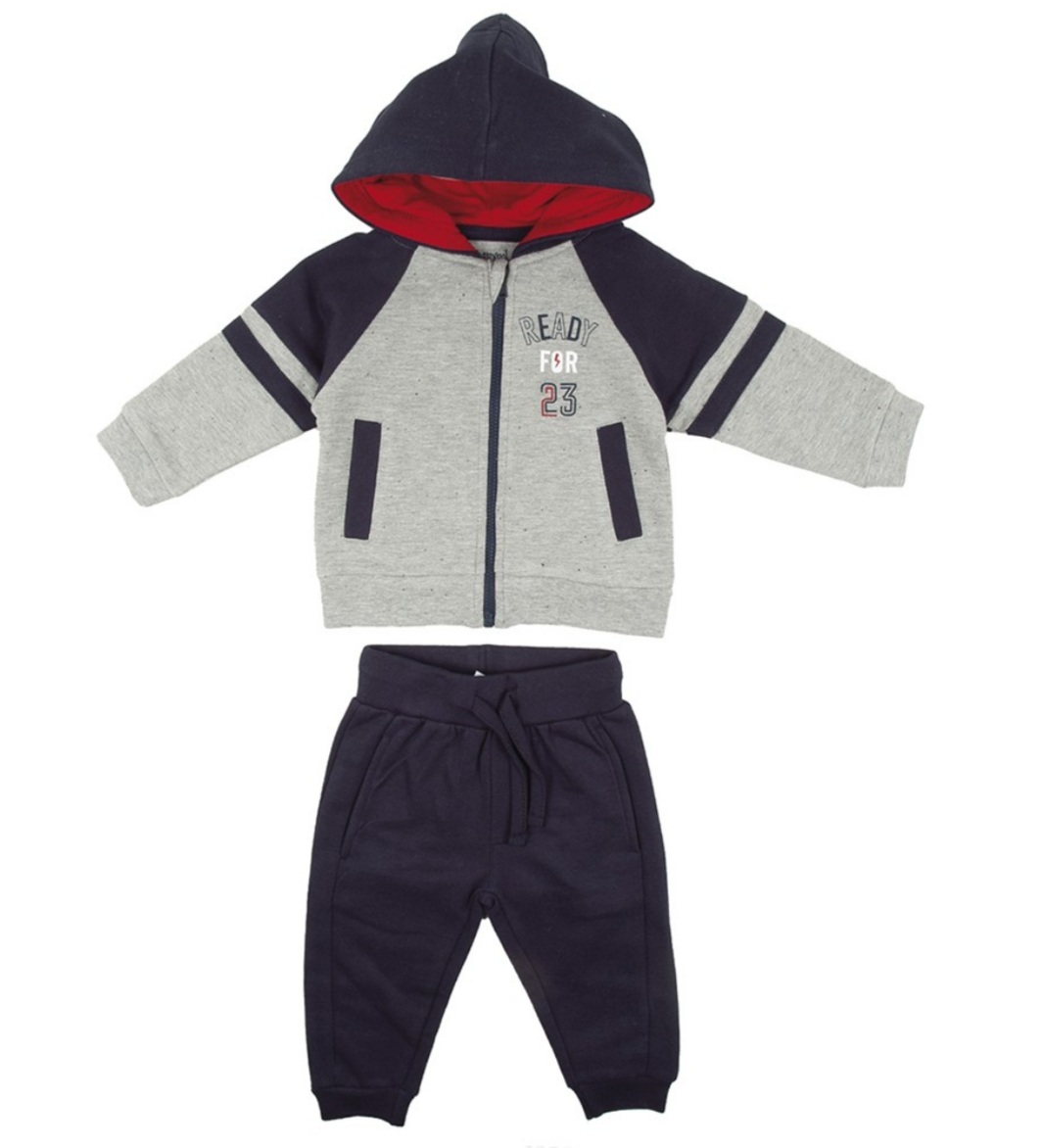 Chandal para bebé de la marca Babybol con sudadera abierta con cremallera, capucha y bolsillos laterales que combina con pantalón liso con cintura ajustable. Se envía en caja.